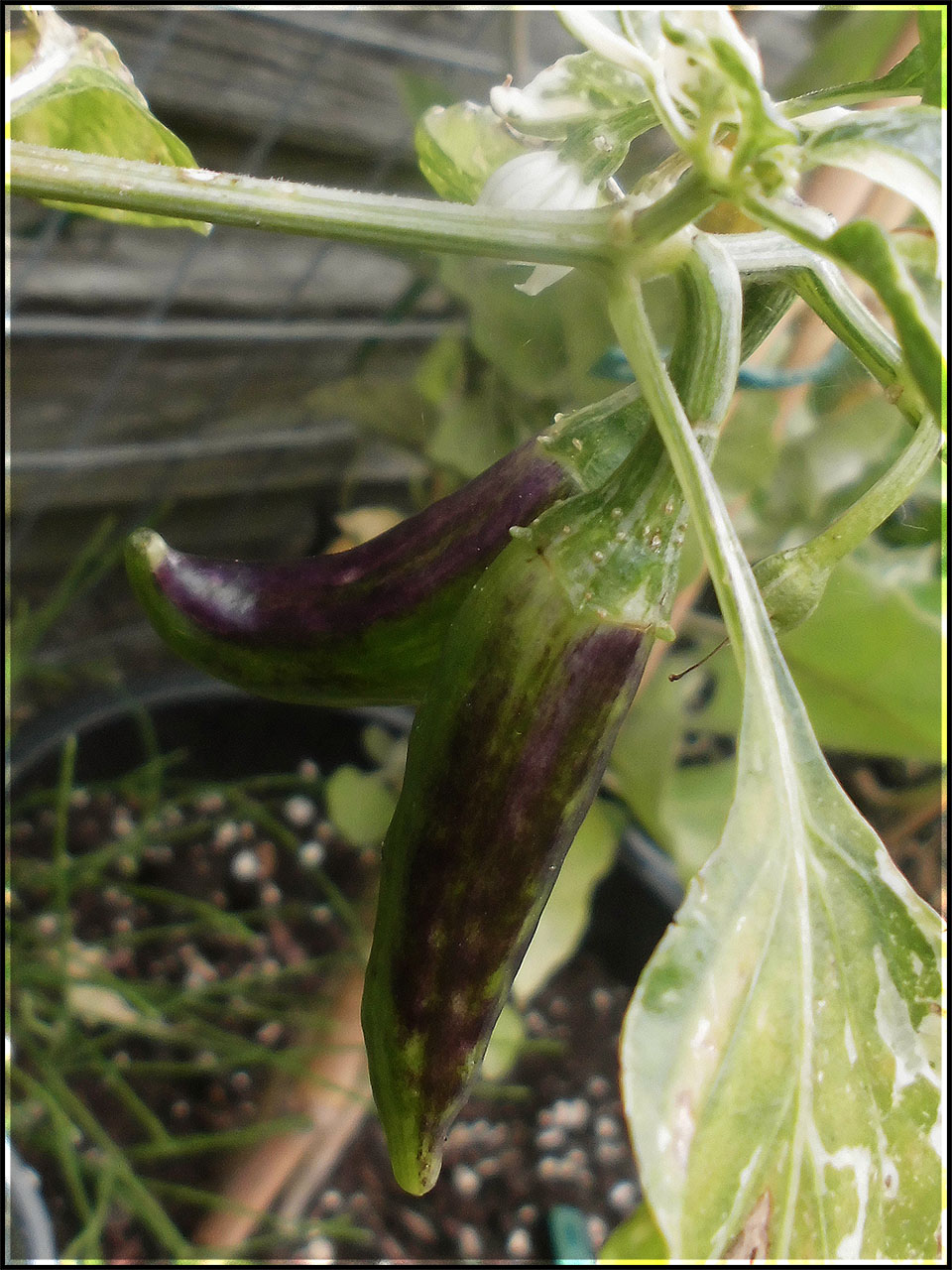 Pflanzenname: Fish Pepper Galerie: Fish PepperUploader: MikeBeschreibung: Fish Pepper mit lila Verfärbung verursacht durch pralle Sonne